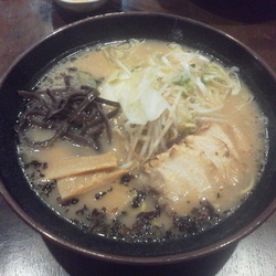 先だっての沖縄出張の夜に。味噌が大変おいしうございましたので今回は豚骨醤油を。ちょうど「豚骨」と世にいう「豚骨醤油」の中間ぐらいかしらね、旨かったです。
