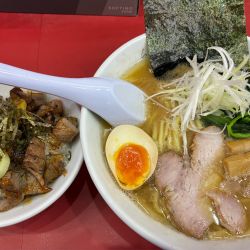 太麺、硬めライスありでオーダー。相変わらず斜め向かいの家系と良きライバルで切磋琢磨してますね(勝手な判断)。安定のしっかり豚骨醤油スープと絡む麺、満足度高いです。