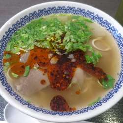 牛ベースにパクチーの香りが移ったスープは独特な風味、日本のラーメンとはそもそもの味の方程式が異なるようだが個性があって個人的に嫌いじゃない。