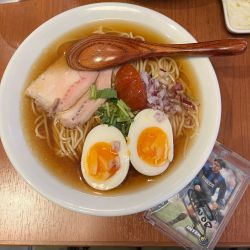 スープは、薄らと茶色みを帯びつつも透明度の高い清湯。表層に少量の油滴が浮かぶ。
