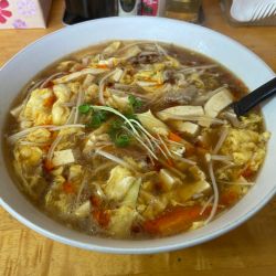 お酢が効いてあんかけで熱々、野菜も豊富でたまごとじが食欲をすすります。細麺がまた絶妙にマッチとても美味しいです。
