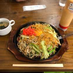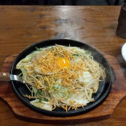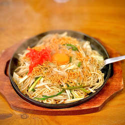 熱々の鉄板に盛られた麺と具材と生卵!