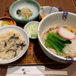 BRBでのお仕事の最中のランチ。今日はお初となるこちらへ参りました。エンゼルの方はビル解体のようでやってないのかな。ま、それはともかく田町駅改札からすぐのこちら本店で、今回は定食を頂きました。そばは冷やしたぬき、炊き込みご飯と小鉢、それに香のものとデザート(杏仁豆腐)がついた豪華版。味も良好、来てよかったです。