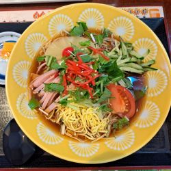 店に入ると正面の壁に貼ってあった、夏メニューから冷やし中華と中華ざるのメニューが無くなっています。でも嬉しいことに冷やし担々麺は残っていたんですね\(~o~)/