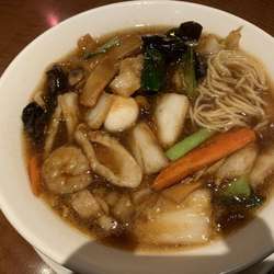 仕事終わりにコチラ。五目だけあって具材が賑やかなビジュアルの一杯。