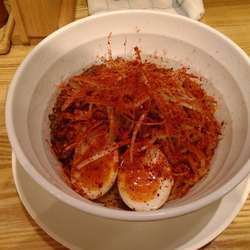 しばらく待って表題が登場。写真の通り唐辛子がまんべんなくかかり、まっかっかの状態。離れていても強烈な香り(刺激)が鼻を突く。西山製麺の黄色い麺の上に千切り玉ねぎと味玉が乗り、ひき肉などが入った特製ソ... 続きを見る