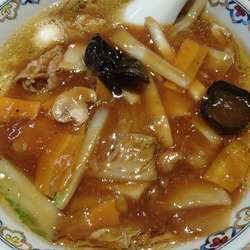 甘辛庵たっぷりなスープはとにかく熱々ですw野菜もたっぷりでウズラの卵やキクラゲ、エビなど具沢山でお腹いっぱいっす😁