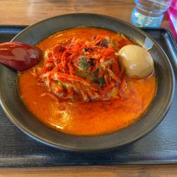 激辛タンメン950円、味玉110円、合計1060円。濃厚激辛スープ、ベースは味噌っぽい、旨味たっぷりコクがとても美味しいですね。中太やや細めの麺がとても合う。野菜シャキシャキ、味玉あんこ風で味良好。この旨味辛さは私の中ではドンピシャの味、汗だく。