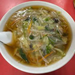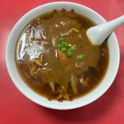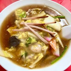 あっさりやや甘めで生姜の効いたスープに、炒めた肉・野菜の旨みや香ばしさ溢れる熱々の餡があわさります。