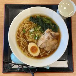 スープは、明るめの色合いに茶濁。粘度はあまり感じられない。表層には背脂がポツポツと浮遊。