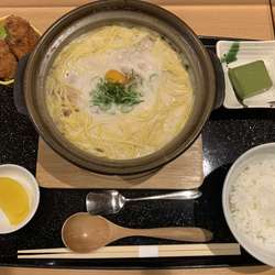 本メニューを選択。暫く待ってから配膳された。盆の上には、土鍋入りのラーメンの他、ご飯(お代わり可)、四万十鶏の唐揚げ2個、沢庵2切れ、黒蜜のプリンも載せられる。