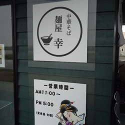 ・店の外観:白色地に黒色文字の看板、白色の暖簾、メニューの張り紙。