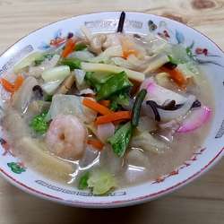 海老と豚肉・かまぼこに加え、白菜・玉ねぎ・人参・椎茸・マッシュルーム・きくらげ・たけのこ・きぬさや・いんげん等、とにかく具材の種類と量が豊富な塩味スープのチャンポンです。