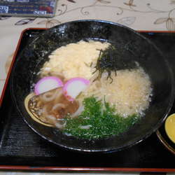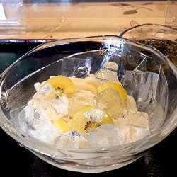 カットしたキュウイをのせた、コシのつよいツルツルのうどんが氷の中に沈んでいます。キュウイのさわやかな香りと甘口のつゆが良く合います。
