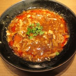 まず見た目がとてもきれいでそれだけで食欲が掻き立てられる。黒酢のしっかりした酸味とラー油によるピリ辛の一段上の辛さとのバランスがよく、全体にわたりとろみのあるベーススープのコクもあり、なかなかおいしい。酸味に尖りがない... 続きを見る