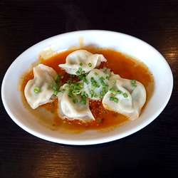 ゴマペーストの担々風のピリ辛なたれが美味しい、ぷりぷりモチモチの水餃子。