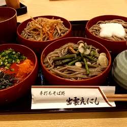 少し硬すぎるくらいのコシのつよい蕎麦です。割子の具はそれぞれ山菜・山芋・きんぴらごぼうで薬味に小ねぎ・もみじおろし・刻み海苔・削り節が付きます。甘辛いつゆで色々な味が楽しめます。