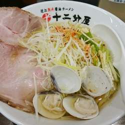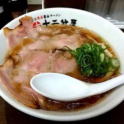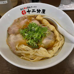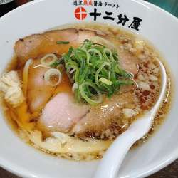 19/12/22訪問。過去分ですが、閉店しているので、足跡を残させていただきます。甘口柚子醤油(800円)を。スープは、ネーミング通り、甘めの醤油感に、柚子が漂う。麺は、なめやらかな中太ストレート。具は、白髪ネギ・みずな・穂先メンマ・チャーシュー二枚。デフォルトで、一味がふりかかる。十二分屋は近江熟成醤油 十二分屋 早稲田店以来の訪問でした。
