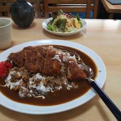 おばちゃんが注文取りにきます。「カツカレーください」とオーダーすると、「ジャンボじゃなくて普通のカツカレーね?」