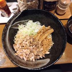 こまかなチャーシュー、メンマ、ネギがトッピングされ、ジャンキーではない上品な汁なし系のまぜそば。もちもちした麺が美味しかったです。途中で酢と辣油を加え味変。最後まで美味しくいただきました。