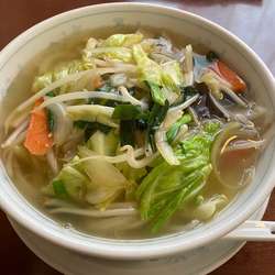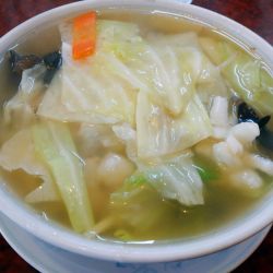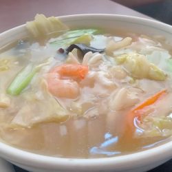 海鮮麺といいつつ海老1尾、イカ1切れだけでほとんど野菜。ただ海老もイカも味はよかった。スープはやさしい塩味。キャベツは柔らかくて美味しい。