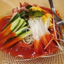 麺は、むっちりとした太麺。写真の感じだと、うどんのような極太麺に見えたが、実物とは違い少々残念。