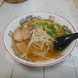 歯ごたえの良いチャーシュー2枚にもやし・メンマ・ねぎをトッピングした、ツルツル麺のさっぱり塩ラーメン。