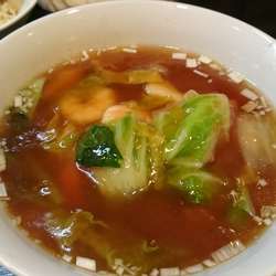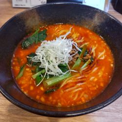 澄んだ中華スープに濃い朱色基調の担々の彩り。