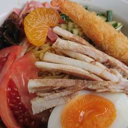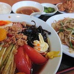 冷やし中華は、ちょっとピリ辛。あっ!ミカンがピリ辛。味が移ってる。