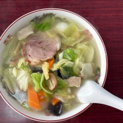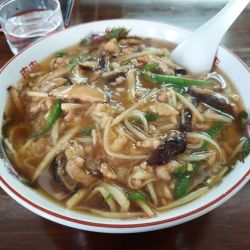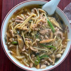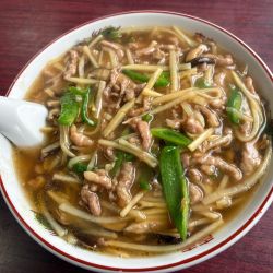 ルーはあんかけとなっておりタケノコ、ピーマン、椎茸と大量のあんが掛かったラーメン🍜