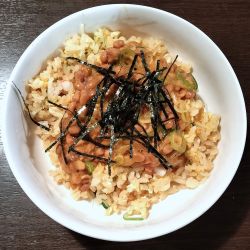 ホクホクのチャーハンの上に、よーくかき混ぜられて泡のたった納豆が乗っています。これをよーくかき混ぜて食うと⋯