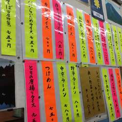 | 備考 | ラーメン 550 ワンタン 550 タンメン 700 もやしそば 700 ワンタンメン 700 ワカメラーメン 700 ネギラーメン 700 メンマラーメン 700 味噌ラーメン 700 ネギ味噌ラーメン 850 広東メン 800 五目そば 800 五目ワンタンメン 850 チャーシューメン 900 チャーシューワンタンメン 1000 当店特製 ちゃんぽん 900 皿うどん 900 あんかけ焼きそば 900 カタ焼きそば 900 特辛ラーメン 800 つけめん 750 昔の味 当店自慢 支那そば 800 |