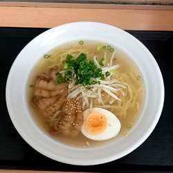 薄い焼豚・もやし・ねぎ・ゆでたまごとシンプルなトッピングのあっさり塩ラーメン。