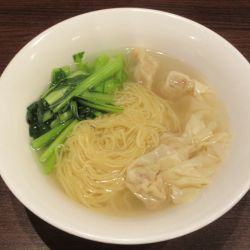 大陸系にときどき見られるデフォが塩のワンタン麺で、スープは割と厚みがあり、コクもまとまりよくなかなかおいしい。塩加減も丁度良い。