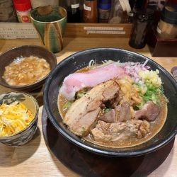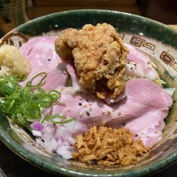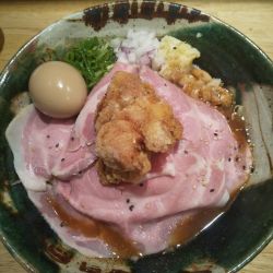 スライスの低温チャー3枚に鳥の唐揚げと肉量が非常に多い、厚めの液体油+背脂でスープがライトでもかなりヘビーな仕上がり。