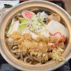 ビジュアルは海老の天ぷら・ナルト・ほうれん草・ネギが乗っています