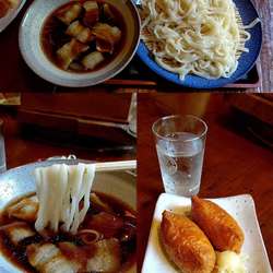 てゆかホド良く柔らかモッチリで喉越しの良いうどんゎ( ゚Д゚)ウマー♪ただ豚バラ肉入りのツケ汁が思ってたよりも甘めだったのゎ少し残念wんでいなりゎ甘酢の加減が漏れにゎちょうど良く思ってたよりも美味しかった♪