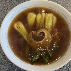 片栗粉を施した豚バラの甘辛な味付けも、麺やスープによく合う。