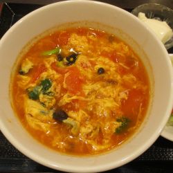 トマトたっぷり、キクラゲ、青菜を溶き卵で餡にしてスープに入れている。ただ、野菜高騰の兆しありか?トマト減量の気配いあり。