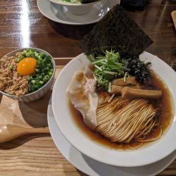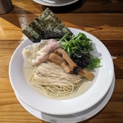 和牛スープに煮干し、焼きあご、鰹等を荒々しく炊き上げたとの事ですが、牛と魚が喧嘩せずガツンと主張しあっている凄まじいスープ😆縮れ中太麺との相性も💮メンマ旨い!接客最高😁何より限定で、味変え自家製辣油まで付いてのこの価格に感謝です。