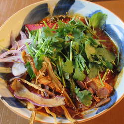 立ち飲み居酒屋が週末ランチタイムのみ提供。インスタによると豚骨+野菜+スパイスとある。程よい辛みとほの甘さが同居するさらりとしたスープで、トムヤンクンラーメンやカオソーイなどを思わせるが、タイ系と比べ、酸味が強くないのが特徴的。動物系のコクを背景に割と複雑なスパイス感があり、様々な旨味がかわるがわる顔をのぞかせ、最後ま... 続きを見る