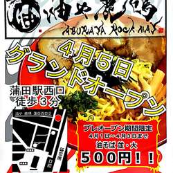 | 備考 | 油そば専門店 地獄の担担麺 天竜 蒲田店跡地に居抜きでオープン 2023.4.22閉業(業変を予定) https://twitter.com/rokumei_kamata/status/1642425729756581889 |