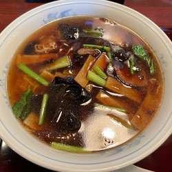スープは醬油系 麺は細麺のややちぢれ