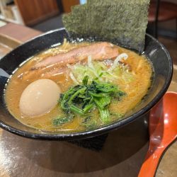 見た目はまずまず。全部載せとしたら寂しいか。味玉、ほうれん草、ネギ、チャーシュー2枚、海苔5枚。麺は家系中太麺長め。では実食。
