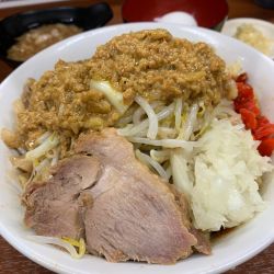 「限定カレー油そば大」@どでん 西川口店の写真行きつけの二郎系店でいつもはラーメンを頼むんですが、新しい限定が気になったので我慢せずに選択。