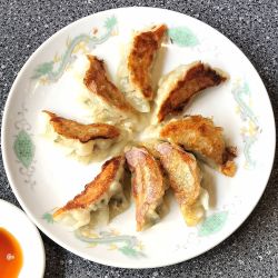 ラーメンセットのお供に頼んだ、ギョウザ460円です。ラーメンもチャーハンもお安いのに、ギョウザは460円?と思ったら、なんと8個も乗ってました。おーいぇい!