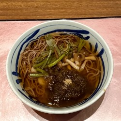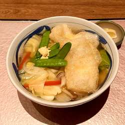 具だくさんで彩りも良くすごく美味しそうでしたが、薄味でイマイチのように思いました。揚げ餅とあんが最後まで熱々でしたので寒い日にはおすすめです。また薬味に生姜(絹さやの上)とレモンが付いて味変も楽しめます。