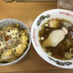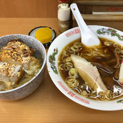 ラーメンは一度食べたが名物のかつ丼は前回品切れだったので入店。かつ丼は品切れしている事も多いので残っているか聞くとまだあるとのこと。ならばと半ラーメン・半かつ丼セットを注文した。