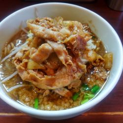 具は、にら・もやし・玉ねぎ・豚バラ。シャキシャキのもやし、しっかりと味付けされた豚バラが美味しい。