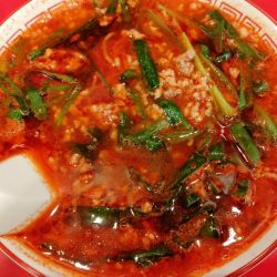 ニラたっぷりでにんにくが強く効いたピリ辛スープ。